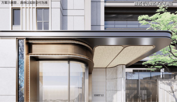在楼栋主入口同样运用石材+弧形铝板等元素,同时还有格栅装饰,质感提升明显: