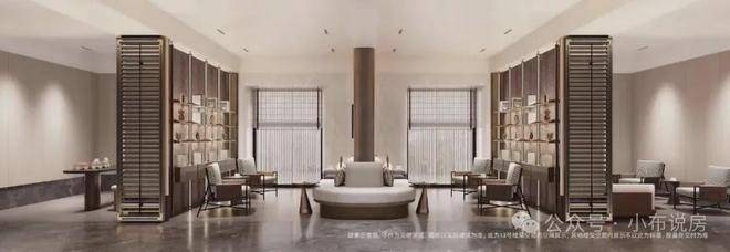 顶部香槟金造型的异型铝板精致典雅,搭配手工打磨的璀璨星空顶,仿若将银河纳入社区;地面仿石砖沉稳大气,与墙面汲取华尔道夫酒店精髓的浅米系大理石贴面相得益彰,营造出优雅静谧的氛围。
