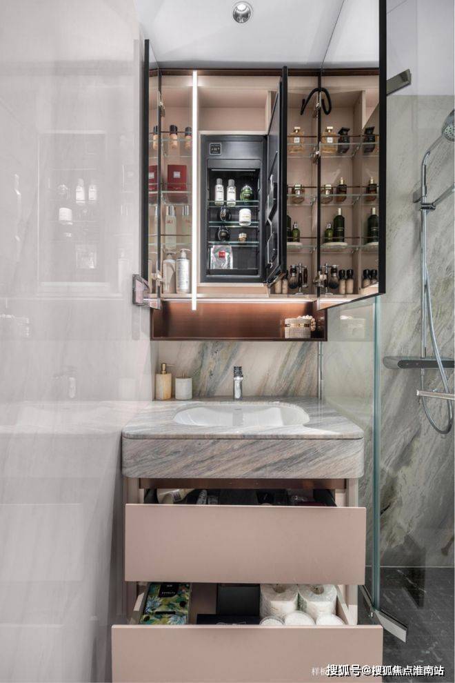 整个镜柜收纳空间,不仅设计了方便拿取的壁龛,还贴心配置了一个可调节温度的美妆冰箱,贴心储存口红面膜等护肤品。