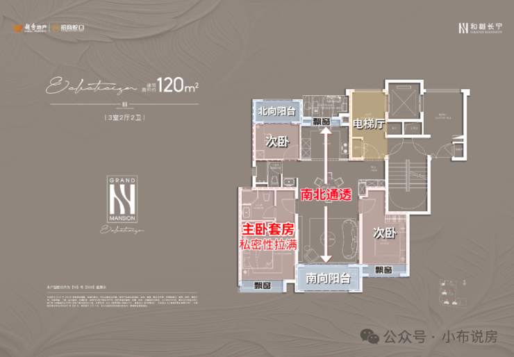 项目建面约120㎡户型也是类独立电梯厅的设计,室内则是标准的南北通透+三开间朝南设计;主卧套房配置,自带卫生间,私密性和舒适度俱佳。