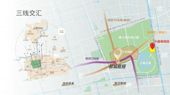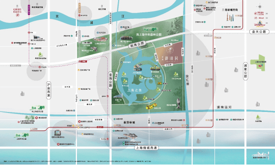 立体交通:目前已开通的地铁5号线无缝衔接1号线通达徐家汇、人民广场;5号线与正在建设中的15号南延伸线及南枫线将均将汇聚于项目西北侧的望园路枢纽。
