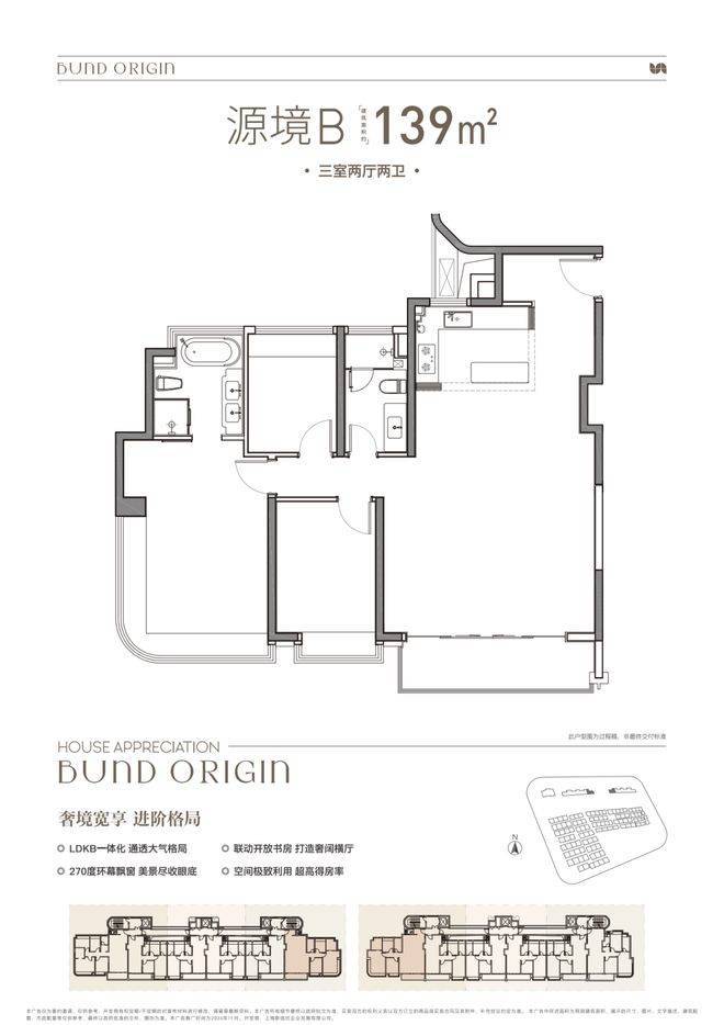 大横厅设计,3房2厅2卫格局,三开间朝南+LDKB一体化+奢阔宽厅+全卧室带飘窗+主卧套房设计+动静分离+主卧270度飘窗+弧形飘窗,舒适度更高。