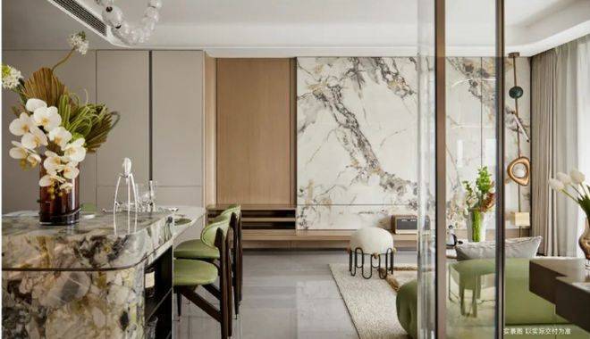 中建山水雅境售楼处电话:400-8787-740☑️☑️客厅岩板背景墙的应用,典雅气派、肌理丰富,营而着简约不失奢华的家居氛围。