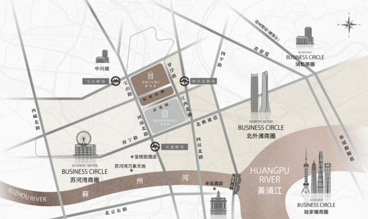 约3公里范围内,汇聚苏河湾万象天地、北外滩商圈、南京西路商圈、外滩商圈、陆家嘴商圈等。