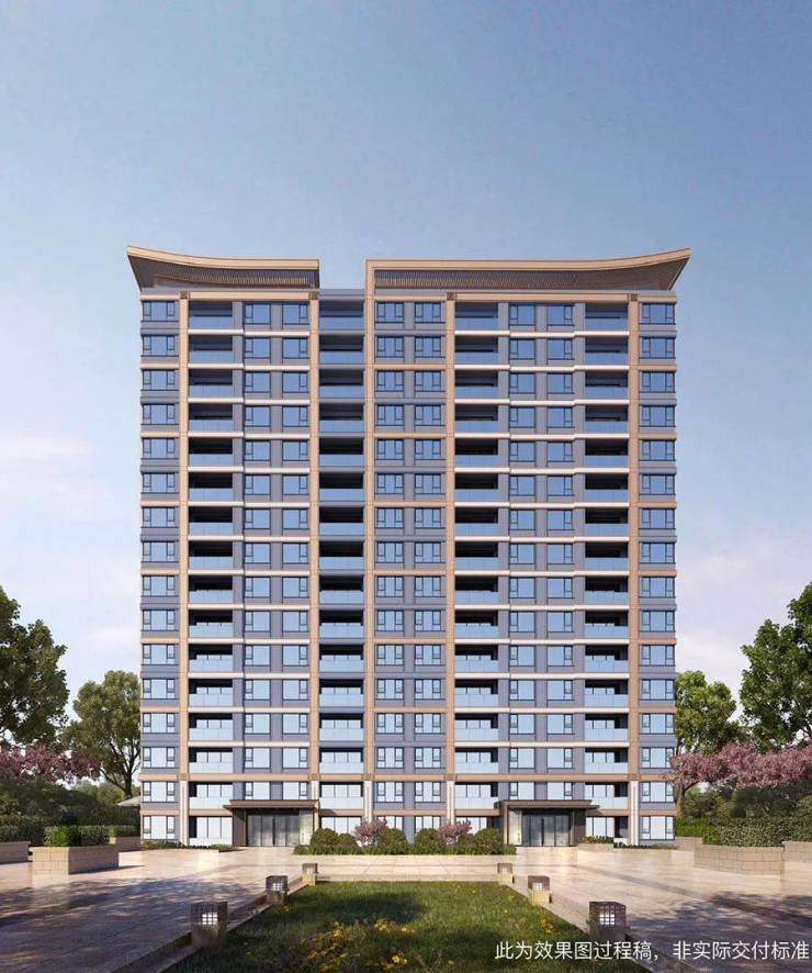 项目建筑外立面主色调为香槟金色与灰色相结合,单元入口部位使用蓝眼睛石材及香槟金色金属;更独特的是,项目将东方飞檐元素融入现代美学立面,形成不落俗套,气质清闲,典雅高贵的现代建筑形象,截取现代潮流元素的同时,亦不失东方大气恢