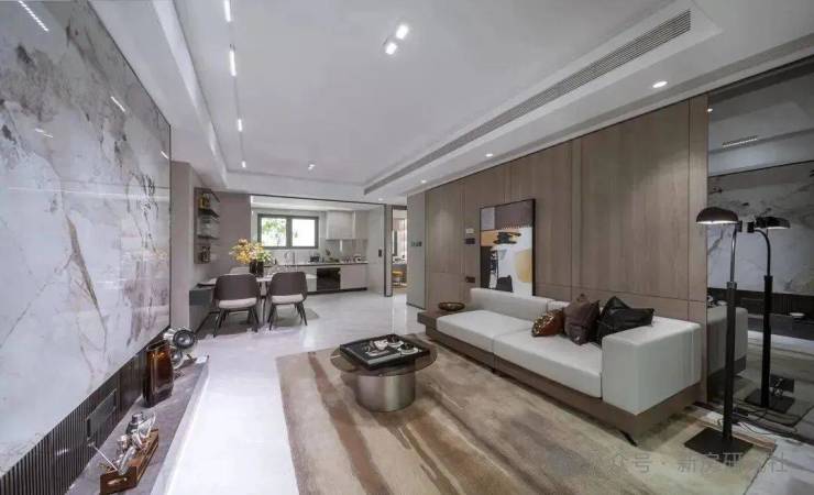 比如卫浴空间,升级镜柜,植入美妆冰箱、主卫卫洗丽等现代化配置;客厅背景墙岩板,客厅采用金属踢脚线,提升整体质感;厨房空间适配真实烹饪动线,配置直饮净水器、大单槽、360°抽拉龙头等。油烟机采用