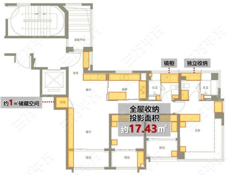 本户型全屋收纳系统布局科学,做到了伸手可及,全屋收纳空间投影面积约17.43㎡,比市面上同面积段其他产品,提升约34%。 客餐厅区域除玄关柜、餐边柜外,还设置了独立储藏空间,别小看这约1㎡的空间,搭配洞洞板和层板,可按需调整高度,收纳行李箱、婴儿车或是户外用品。