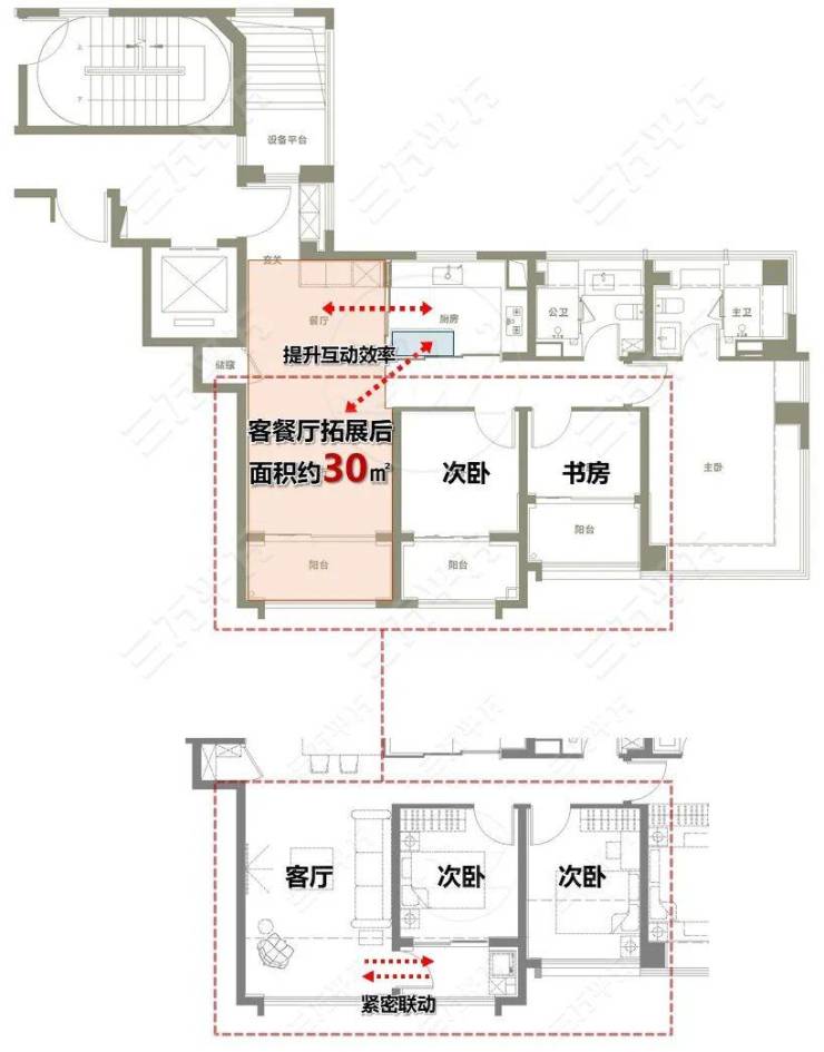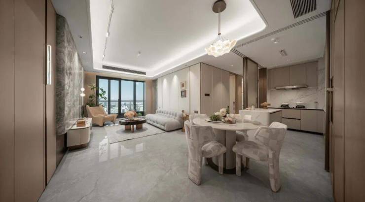 客餐厅阳台、书房阳台,将改造后交付。改造后客餐厅面积拓展至约30㎡,厨房配置联动门,同步搭配西厨岛台,烹饪时可随时关注孩子动态,显著提升家庭互动效率;厨房与餐厅仅一步之隔,动线设计高效便捷,传菜、备餐更加从容。