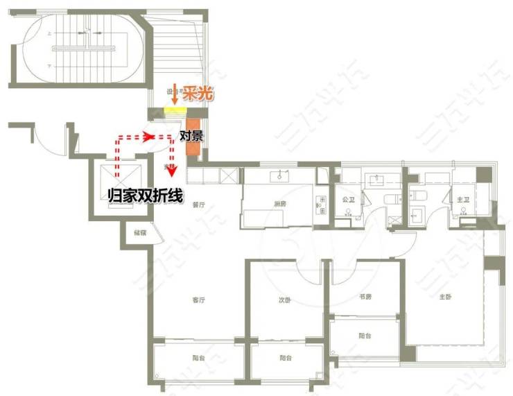 部分户型玄关可采光,可搭配柜体、摆件等形成对景,提升空间美学层次。值得一提的是,电梯厅入户至户内形成双转折动线,既保障了归家隐私,又营造出富有仪式感的归家序列。