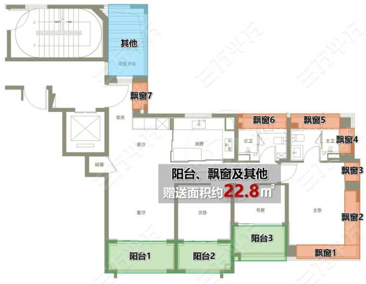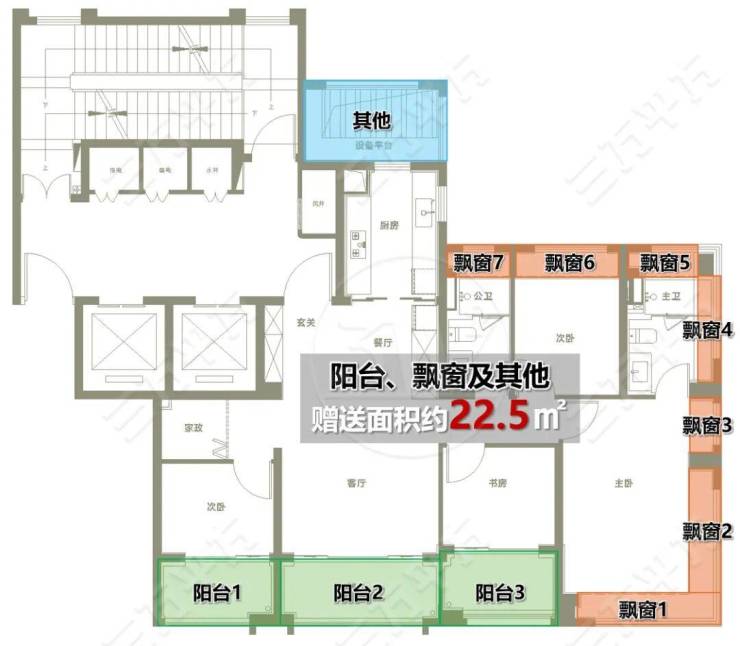 户型总赠送面积约22.5㎡,其中南向三阳台约15㎡(部分计入容积率)、飘窗约8.8㎡(不计容)、其他赠送(设备平台)约6.6㎡(不计容)。
