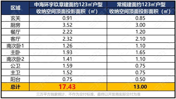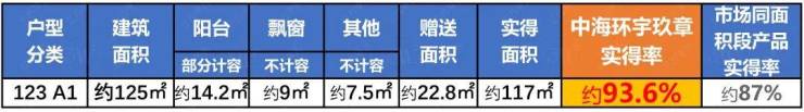 户型总赠送面积约22.8㎡,其中南向三阳台约14.2㎡(部分计入容积率)、飘窗约9㎡(不计容)、其他赠送(设备平台)约7.5㎡(不计容)。叠加赠送后,户型实得面积约117㎡,实得率高达约93.6%。