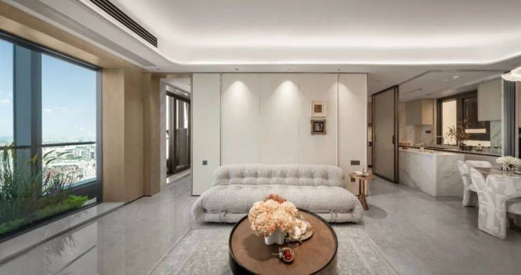 客厅开间尺度由123㎡户型的约3.7米,升级到约4米。阳台均拓展后交付,拓展后客餐厅总面积达到约33㎡,格局方正,与北侧厨房、灵动空间无缝衔接,形成LDKB一体化通透格局,动线流畅且视野无界。