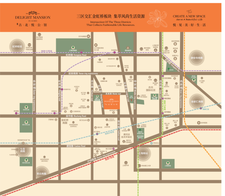 项目位于闵行金虹桥板块,毗邻古北国际社区,一路之隔是虹桥镇人民政府。西面除了金虹桥商业圈,还紧靠着文化名镇七宝古镇,南面毗邻徐汇漕河泾开发区,东面可直达徐家汇,属几大区域辐射的核心位置,距离虹桥交通枢纽约5公里。