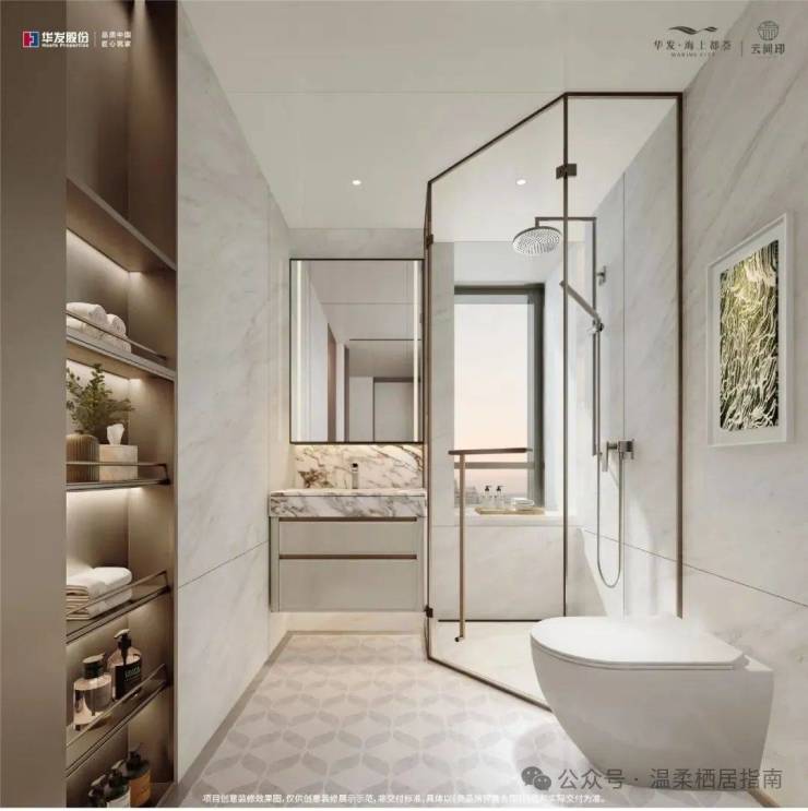 【卫浴系统】主卫恒温水阀搭配顶喷花洒,大理石防滑地砖与长条形地漏完美结合,公卫薄墙移门(不包括I户型)、淋浴区壁龛、一体式新风组合,主客卫双配智能马桶,静享高进阶卫浴系统时光。