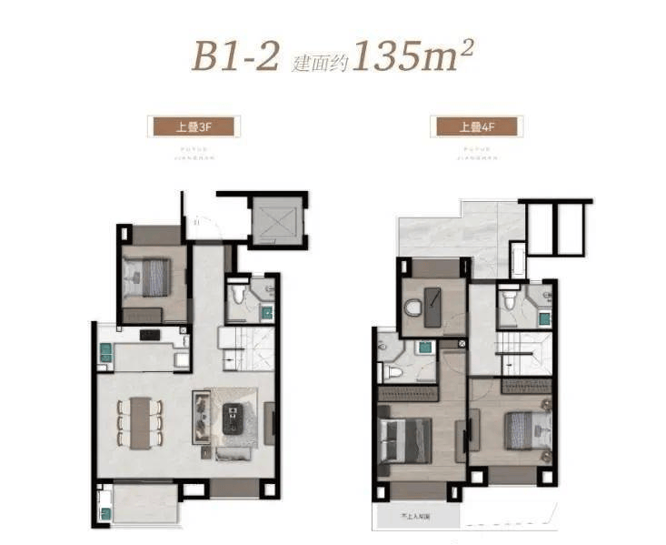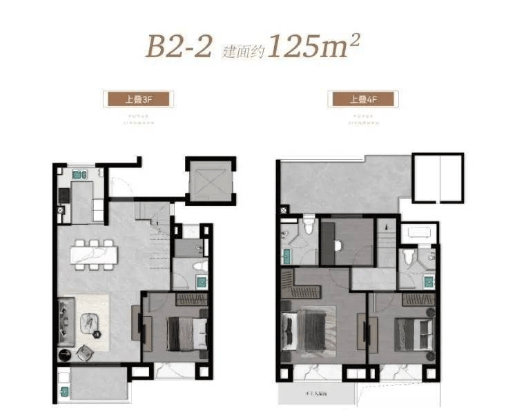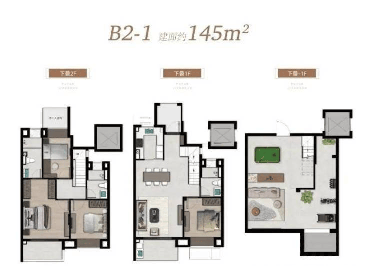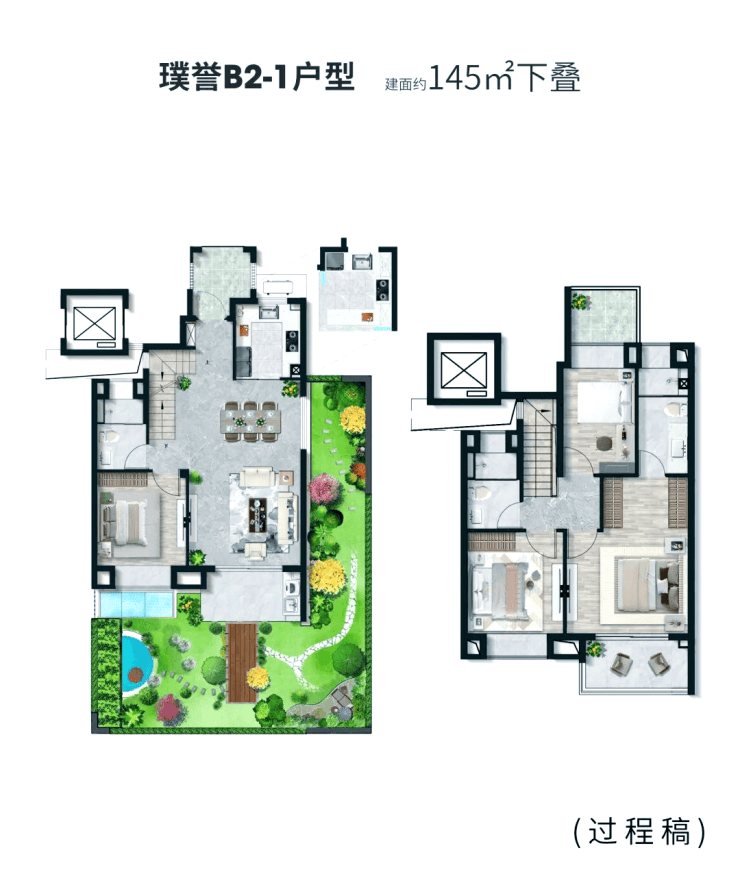 叠墅:建面约123-145㎡,主打空间感,下叠带庭院,上叠有露台。