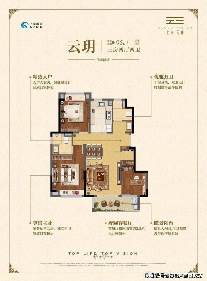约3.5米的面宽更显宽敞、大气,再加上更宽的瞰景阳台,室内采光、通风都非常好;