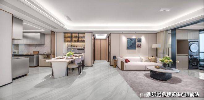 超30㎡餐客方厅采用一体化布局,巧妙地连接南向阳台、U型厨房,形成极佳通风采光通道。轻松容纳6人餐桌,无论是三代同堂的日常用餐,还是周末的家庭聚会,都能从容应对。