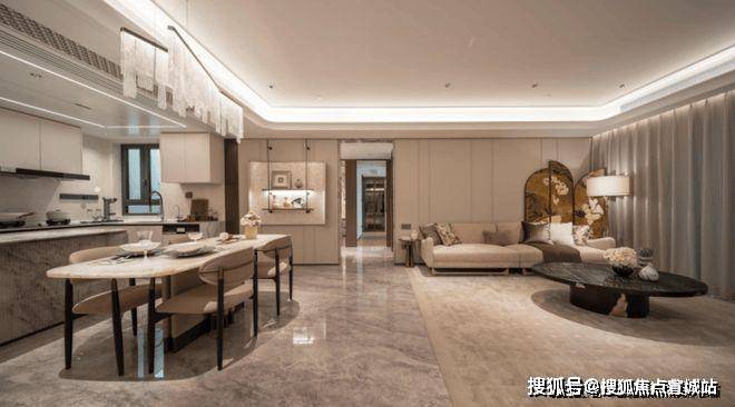 客餐厅方面,电视背景墙采用卡慕白石材+皮革,均为交付标准;地面采用简一(或同等品牌)的900*1800仿石砖,密拼施工,几乎看不到有任何缝隙——相信有装修经验的小伙伴一定知道,这种大砖的价格和这样的密缝工艺成本有多高!