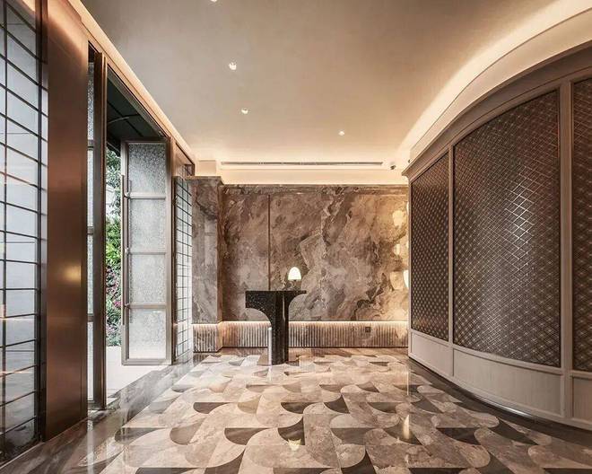 采用米黄色温润石材,巧妙模拟风的流畅形态,营造出既庄重又舒适的归家氛围。这片宽广的流线型石墙在柔和灯光的映衬下,更显璀璨夺目,而风雨连廊的灯带设计,更添一份尊贵仪式感。