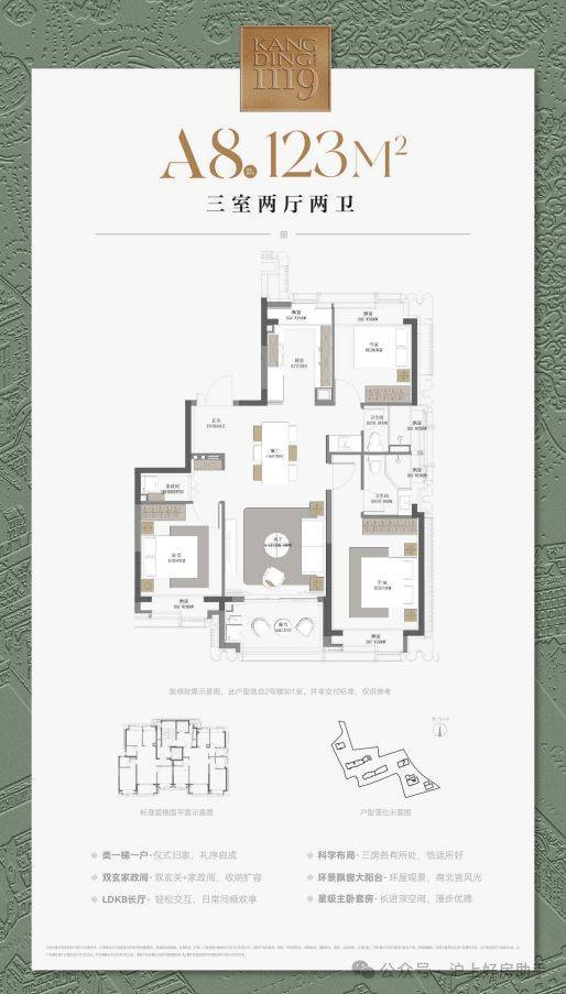 建筑面积约123㎡三房户型,飞机式布局,一镜到底的LDKB长厅,尽显隐贵静安风范;