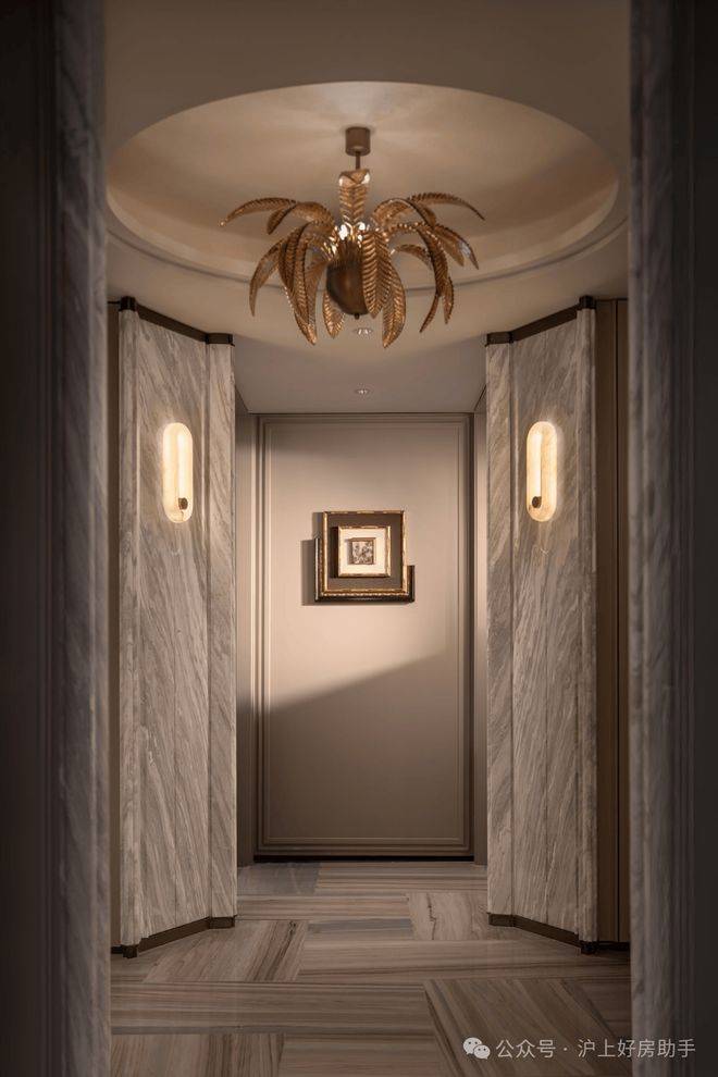 经典十字序列厅:从私享电梯厅开始,经由对开入户门,首先就进入这样一个十字序列厅,视线远处,就是尽头观景台,这条长廊,可以是公私分区的交通枢纽,也可以是彰显主人品味的艺术长廊;