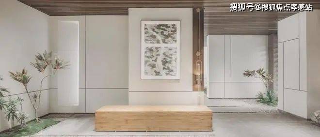 地上入户大堂采用中式经典构图方法——框景,打造未进门,先见景的效果。中国人一直讲究,生活中处处有景。框景的工艺就是能做到从任何一个框望过去都是景色,角度不同景色也不同,一步一景的效果。
