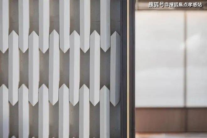 :单元门头整体和小区入口大堂呼应,两侧采用大象灰石材哑光面和拉槽面,搭配定制龙鳞纹金属网,带给业主的出入间的仕第门庭礼序,呈现了现代东方的城市风骨,尊贵感油然而生。
