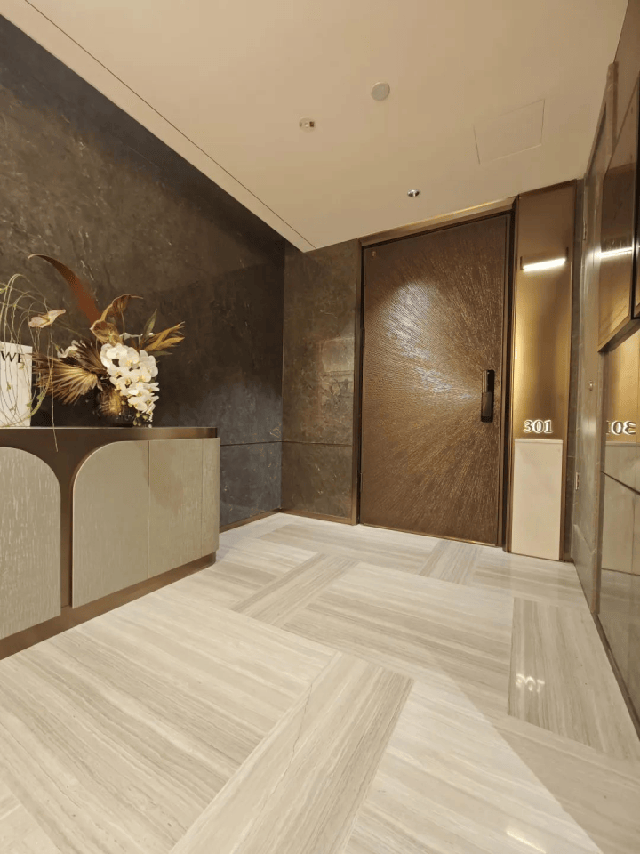 地下归家大堂,电梯厅的地面都是木纹拼花石材,呈现视觉美。