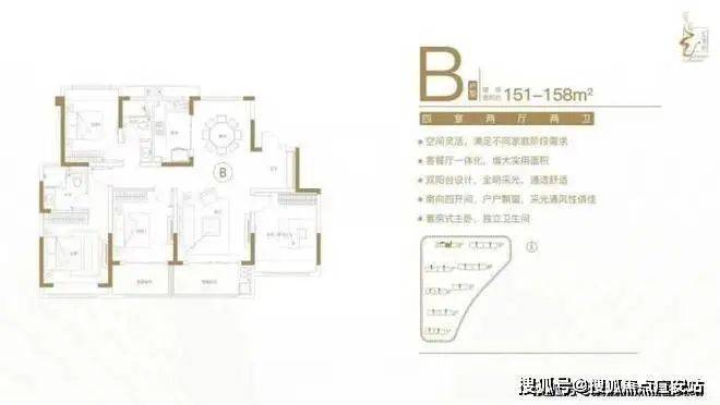 佳运汇龙府预约热线☎:400-8080-420✅✅约151-158㎡四室两厅两卫户型特点:空间灵活,满足不同家庭阶段需求;客餐厅一体化,增大实用面积;双阳台设计,全明采光,通透舒适;南向四开间,户户飘窗,采光通风性俱佳;套房式主卧,独立卫生间。