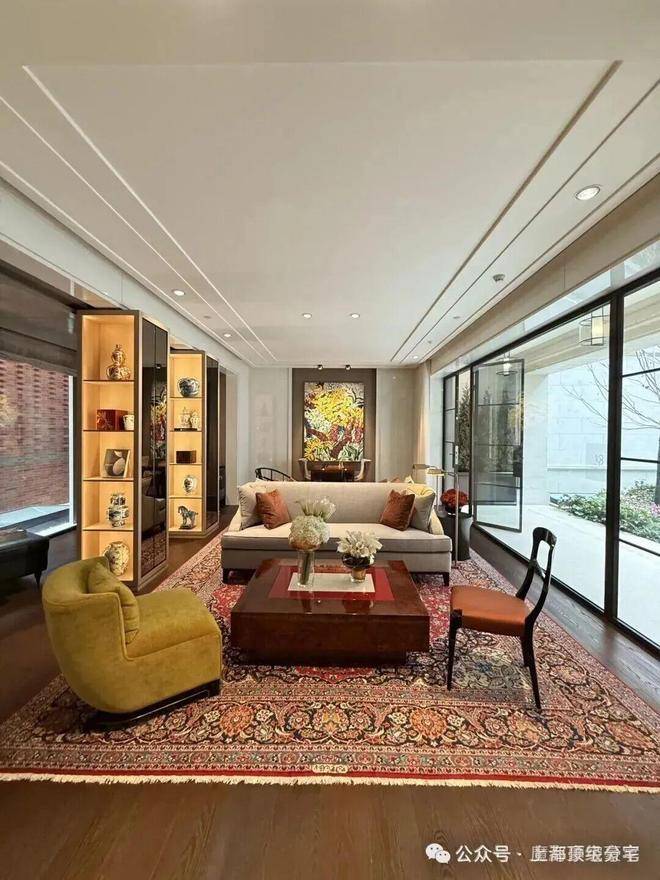 正式的大沙发区域,灵活散座区域,家具注重收藏种类多样性,中式圈椅,西式小沙发,灵活移动,根据需求可聚可散。手工编织的复古羊毛波斯地毯,用植物和矿物天然染料来进行染色,拥有了抗衡时间侵蚀的美,更增加了收藏的丰富性,是高品味的体现。