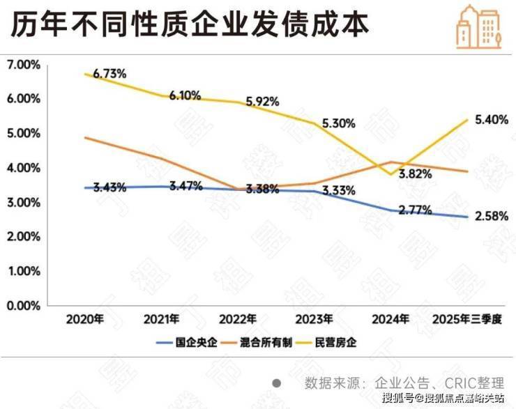 从成本上来看,国企、央企2025年前三季度的融资成本为2.58%,而民营企业则为5.40%,两者之间的差距再次扩大到2.82个百分点;此外混合所有制房企的融资成本下降至3.90%。在当前融资环境下,有充足抵押物及其他增信措施的优质房企更能够在政策扶持中受益,同时也能够获取更多的低息借款。