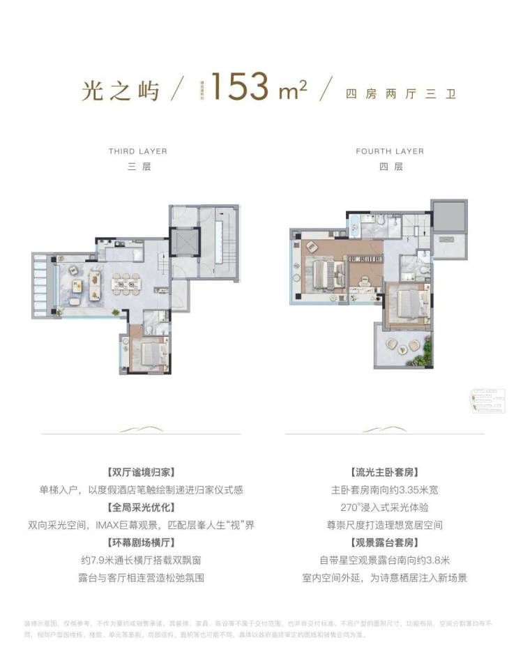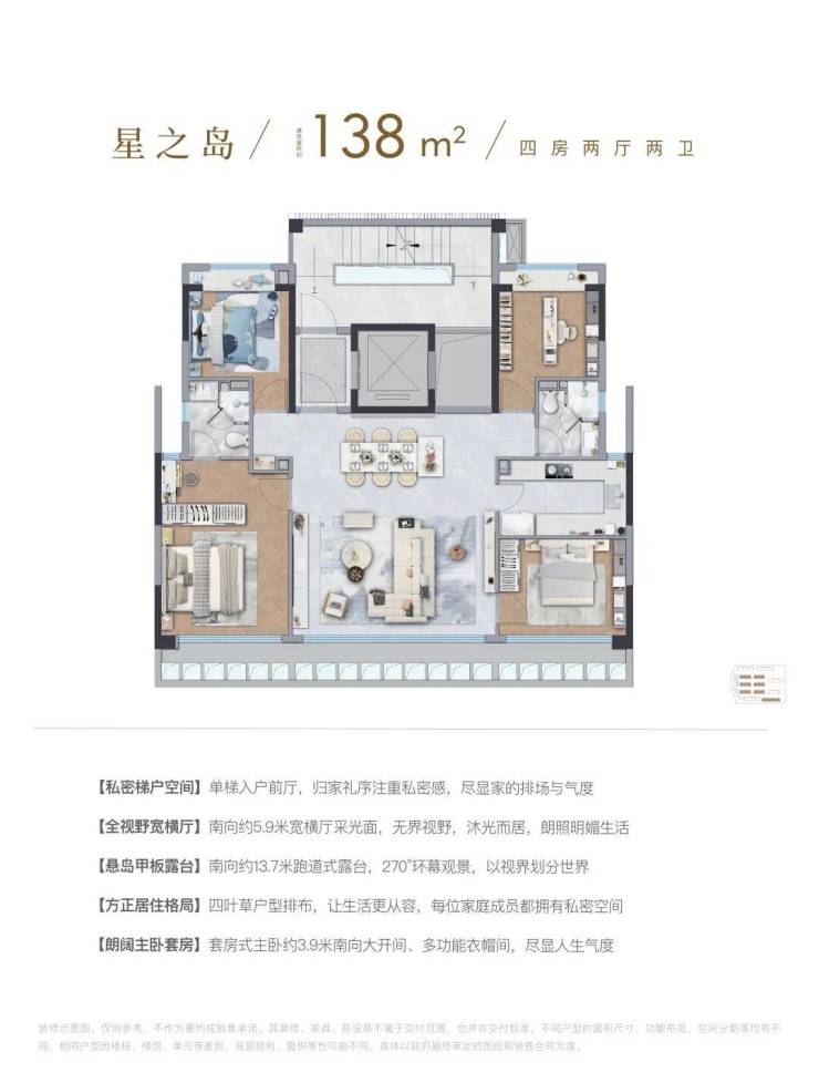 这个四房虽然建面只有138㎡,但因为是5层叠墅的高得房率,以及室内空间的高效利用,其功能和尺度感,给人的感觉十分惊艳。