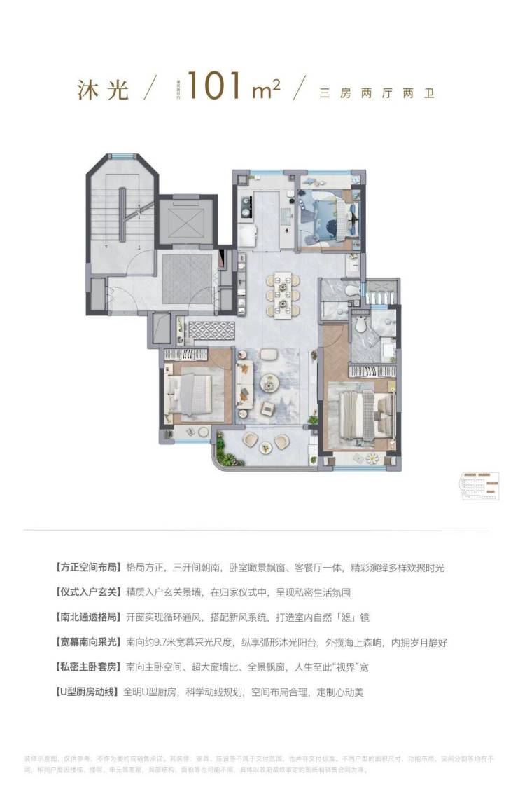 所以,虽然户型的建筑面积是约101㎡的3房,但整个空间的尺度感却能匹配改善型的宽绰3房。