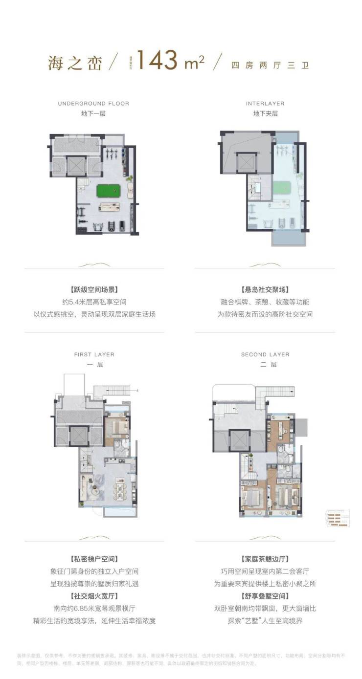 地下一层及夹层空间,可以根据业主需求,打造影音室、健身房、酒窖、棋牌室等各种欢娱空间,为美好生活添加无限可能。