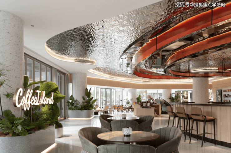 进入营销中心,更能体会空间美学:挑高8米的大堂搭配银色水波纹天花,宛如时间的涟漪,与绿植相互映衬,为空间增添了灵动感和节奏感,营造出充满未来感的艺术氛围。