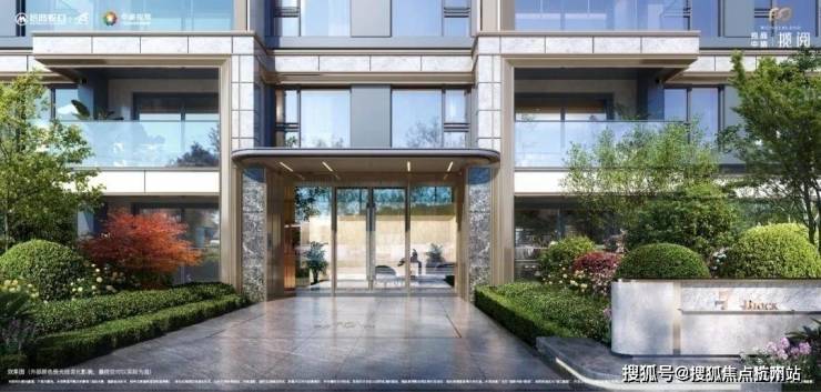 采用香槟金铝型材与灰色石材的入户大厅外墙,香槟金色弧形铝板装饰的门头雨棚,搭配大玻璃面更加通透近人,营造颜值与尊贵并存的归家体验。