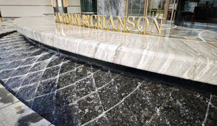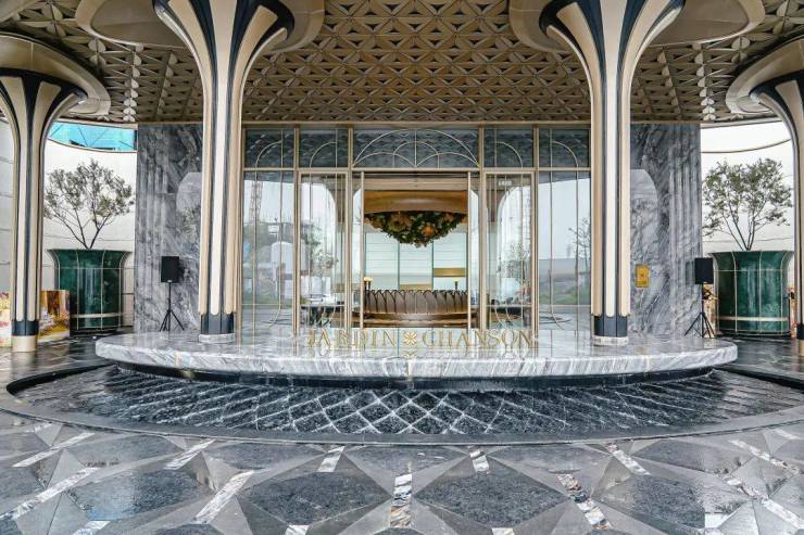 大门口的水景采用了龙鳞水纹的造型。在现场,会有种身处顶奢酒店入户大堂的观感。