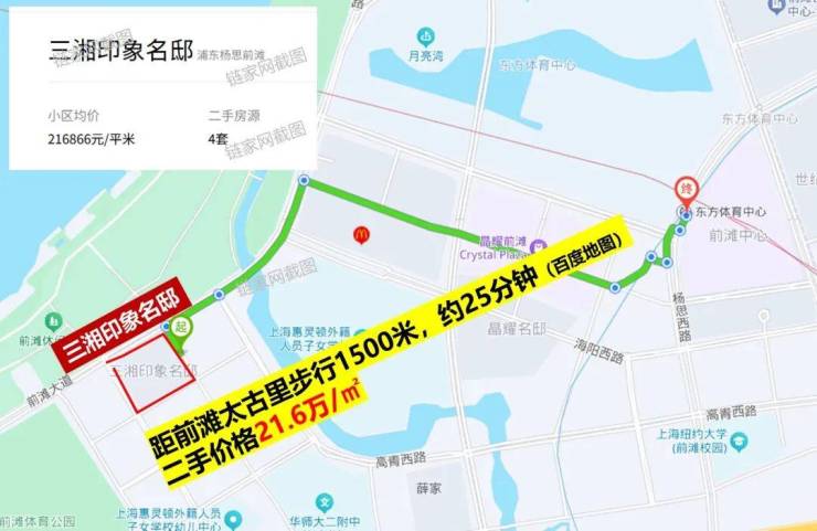 从前滩九宫格走到前滩太古里需要足足25分钟。而前滩九宫格的二手豪宅价格高达21万+(今年2月链家成交的一套三湘印象名邸低区单价17万+)。