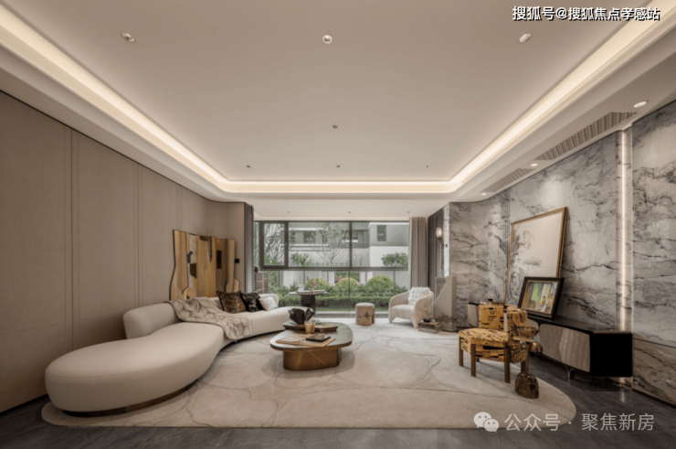 电视背景墙采用卡慕白的石材+皮革造型,弧形吊顶,相当讲究,连空调出风口的形状都打造为海上·清和玺官方售楼处:400-1010-064✨✨logo山茶花的形状~~三大件为大金(或同等档次)中央空调和地暖,新风系统为百朗(或同等档次),南向阔景阳台,采光视野一级棒!
