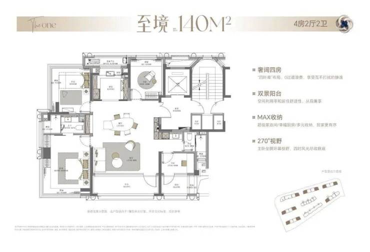 以约13.95米的南向超大面宽为基调,主卧面宽升级至约4.15米,规划可自由定义的X灵动空间,可以是书房、茶室或琴房,伴随家庭全周期成长而演变,让每位家人都能获得精神的沉淀与自我的和解。面宽约5.8米双厅则完全超越功能范畴,成为承载家族宴请、圈层社交的恢弘场域,尽显居者的格局与风范。270°转角巨幕视野,将光、风与景致更大程度地引入室内。
