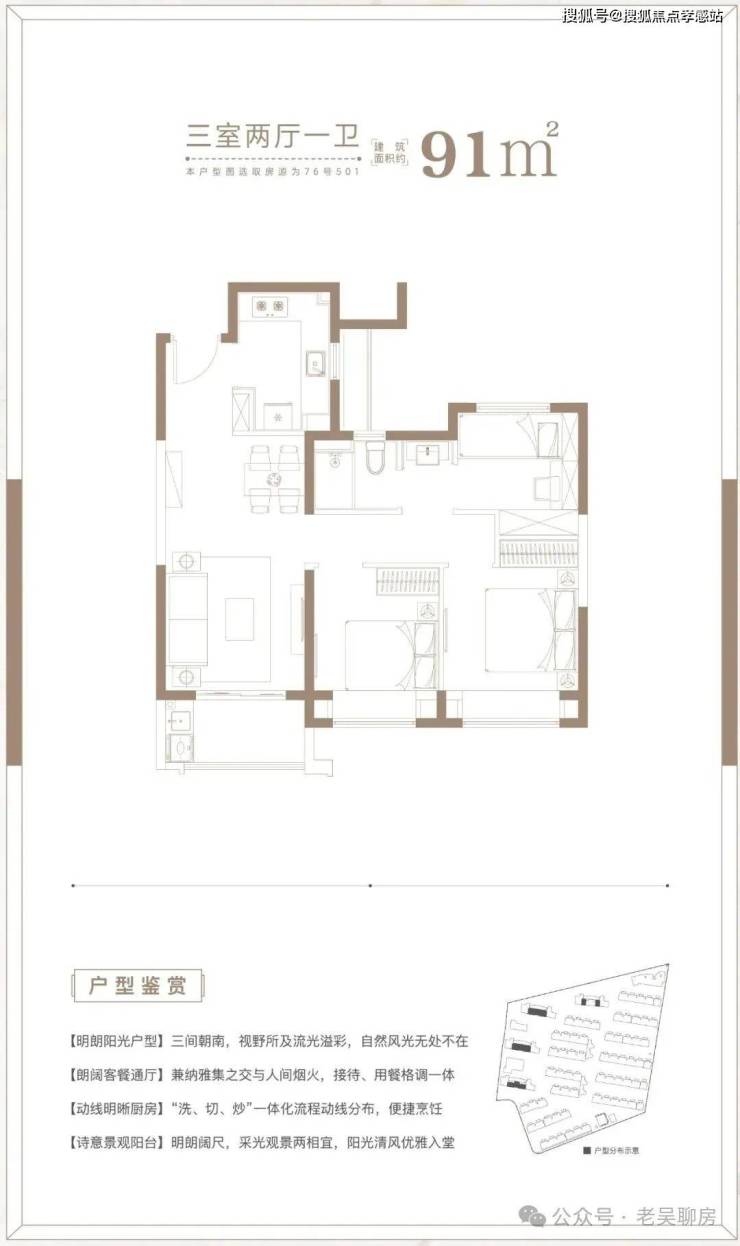 建面约91㎡3房2厅1卫户型,做到了三开间朝南+双朝南卧室带飘窗+动静分离+卫生间干湿分离,采光面拉到极致的小3房户型。