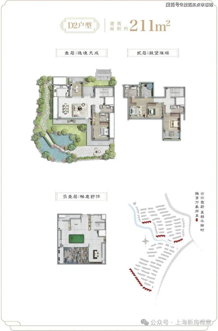 从户型设计上看:建面约138-188㎡联排与建面约211-214㎡院墅产品,庭前绿地,大面宽,地上仅2层,真正的低密宽境别墅,产品力断层式领先。