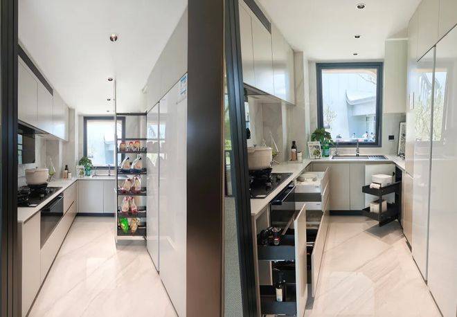 ④加载五金升级、调味拉篮、锅具拉篮,800碗碟三层拉篮,餐厅零食拉篮柜等;容量节省了约250L,相当于5.7个20寸登机箱,极致的收纳。