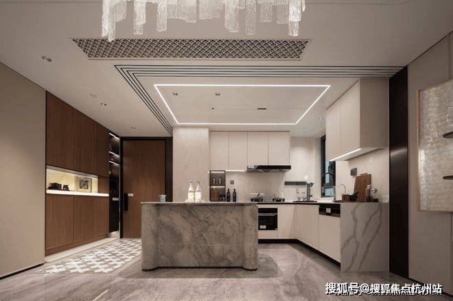 走进海上·清和玺的厨房,墙面岩板通铺,视觉效果超棒。