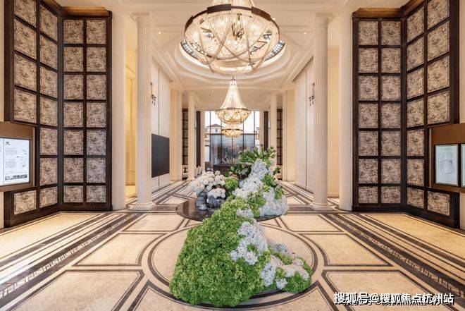 在门庭的环岛空间,景墙面采用中轴对称的设计布局,定制了奢石镶嵌装饰,将曲面艺术与经典石器之美圆融交融。