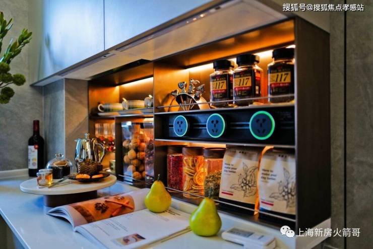 华润虹桥润璟售楼处电话:400-8080-420☎☎进到厨房,开放式的收纳架增加了储物空间,搭配暖色LED灯带很有质感: