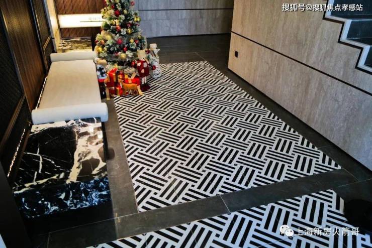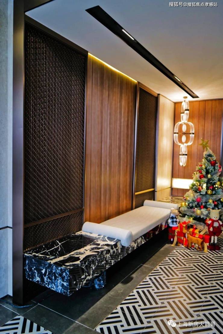 华润虹桥润璟售楼处电话:400-8080-420☎☎项目设计有1楼和地下双大堂,地面皆采用拼花地砖,墙面大量采用岩板铺设、搭配宝格丽黑奢石,材质层次很丰富,从背景墙面的金属格栅到木饰板,满屏所见都是交付标准: