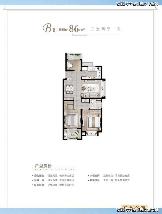 建面约86㎡3房2厅1卫户型特点:做到了双开间朝南+双阳台设计+卫生间干湿分离,一个非常紧凑的小3房户型。