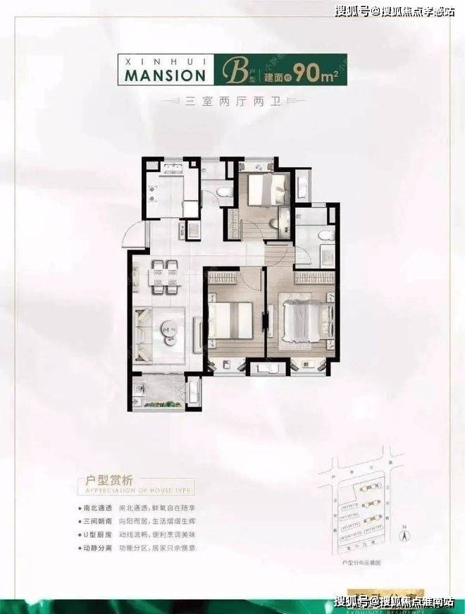 建面约94㎡3房2厅2卫户型特点:做到了三开间朝南+主卧套房设计+全卧飘窗+动静分离+卫生间干湿分离,功能性与空间感完美结合的3房“神户型”。