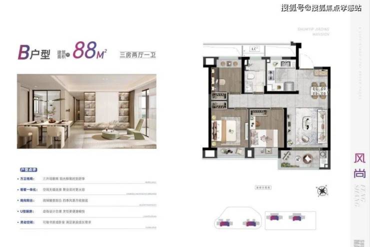 深嘉上府以88-99㎡的明星爆款小户型,圆年轻人的置业梦想。其中,88㎡户型以三房两厅一卫的格局,兼具功能性与尺度感。南向三开间,做到两间卧室朝南,这样的面宽,媲美市面上100㎡户型的新房尺度。u字形的厨房,动线合理。餐厅空间,能够从容摆放一张四人大餐桌。全屋飘窗设计,将赠送空间拉满。